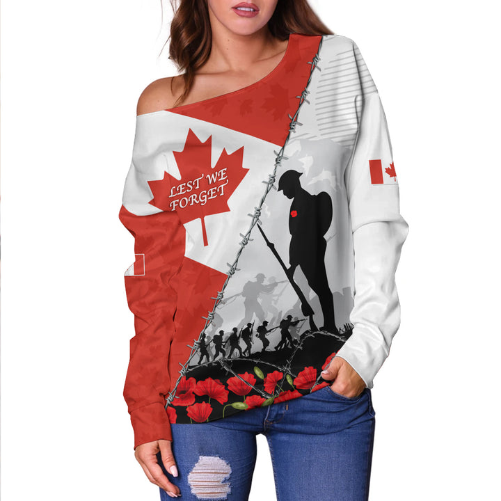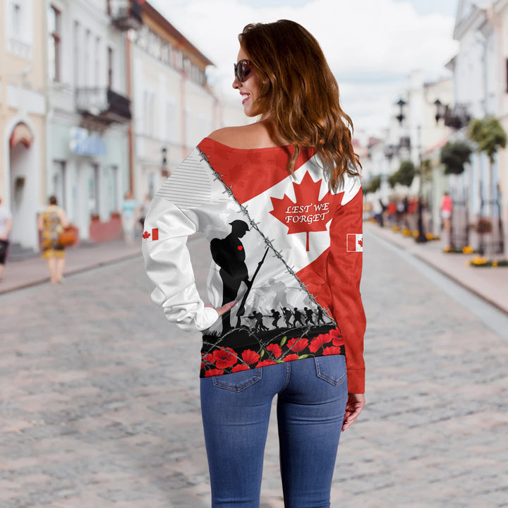 Canada Off Shoulder Sweatshirt Remembrance Day Poppy Flower And Barbed Wire