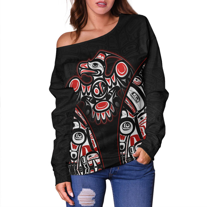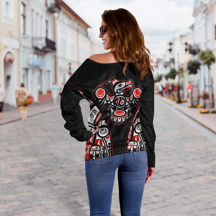 Canada Off Shoulder Sweatshirt Thunderbird Totem Legacy Black And Red Power