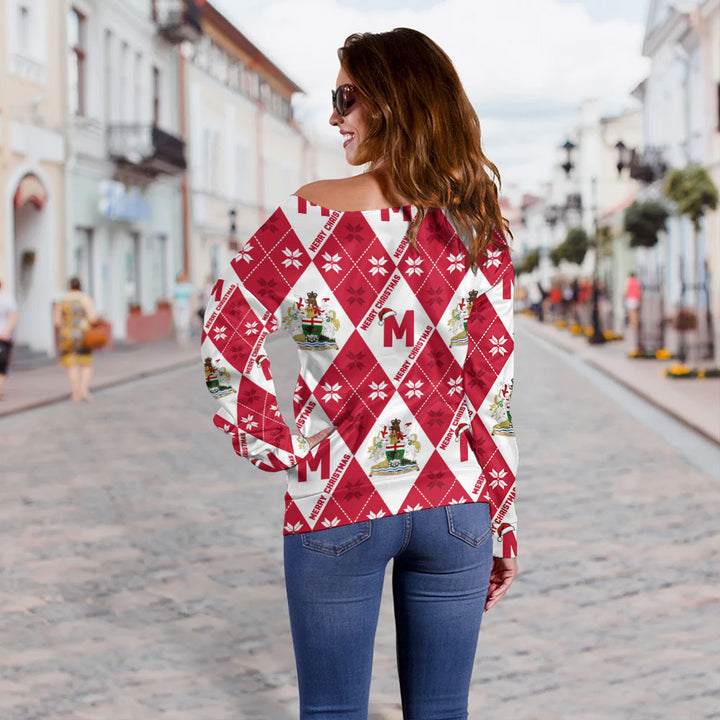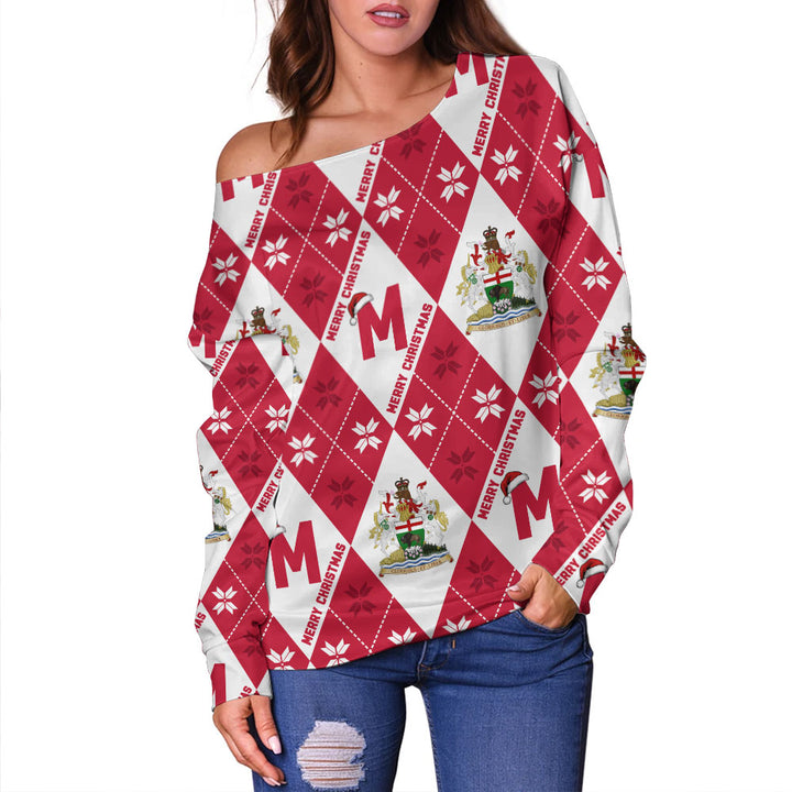 Manitoba Off Shoulder Sweatshirt Christmas Argyle Pattern With Royal Crest