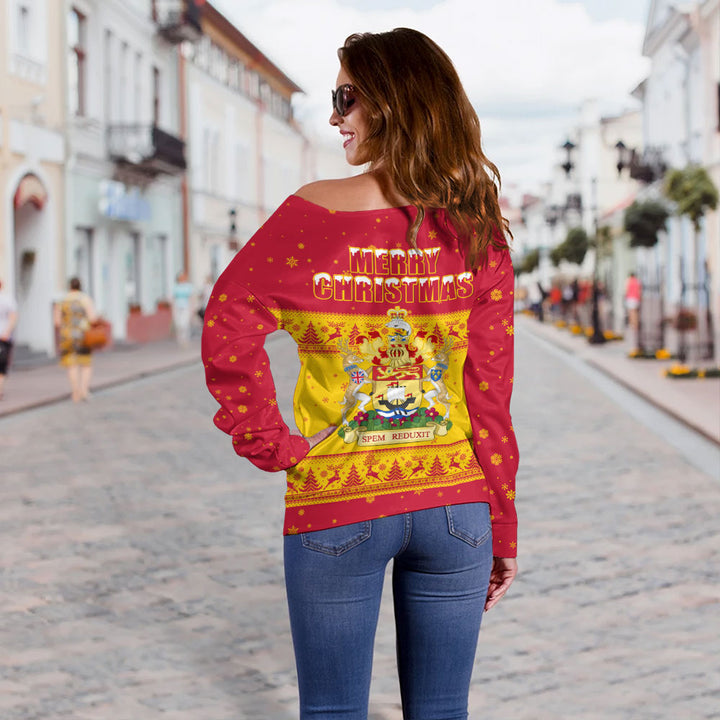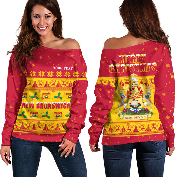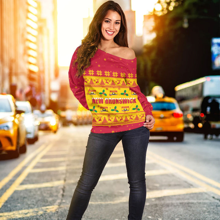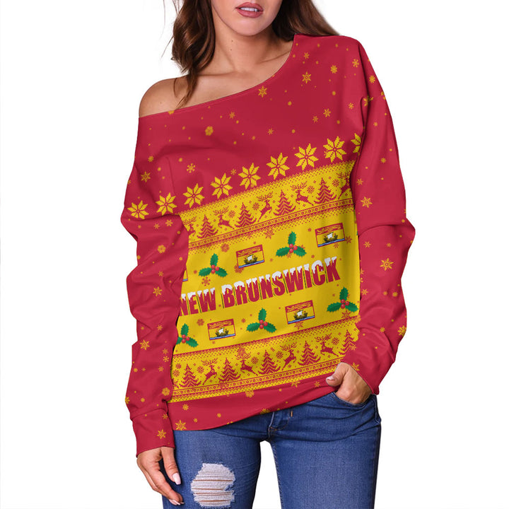 New Brunswick Off Shoulder Sweatshirt Christmas Knit Style Snowflake Reindeer