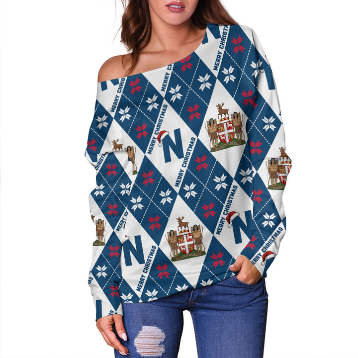Newfoundland & Labrador Off Shoulder Sweatshirt Christmas Argyle Pattern With Royal Crest
