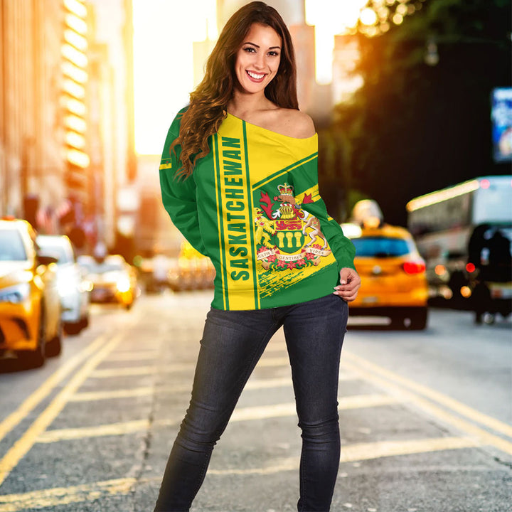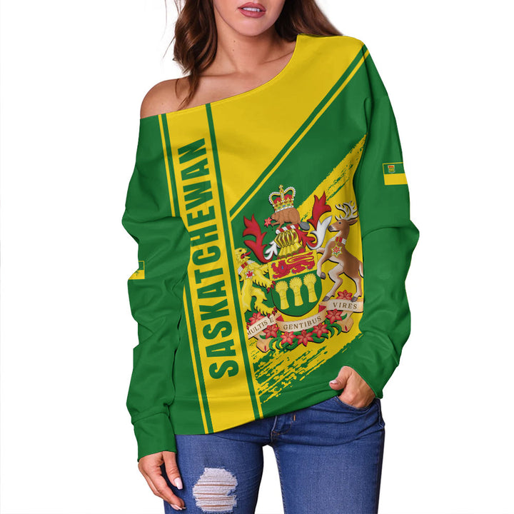 Saskatchewan Off Shoulder Sweatshirt Heritage Strength Crest